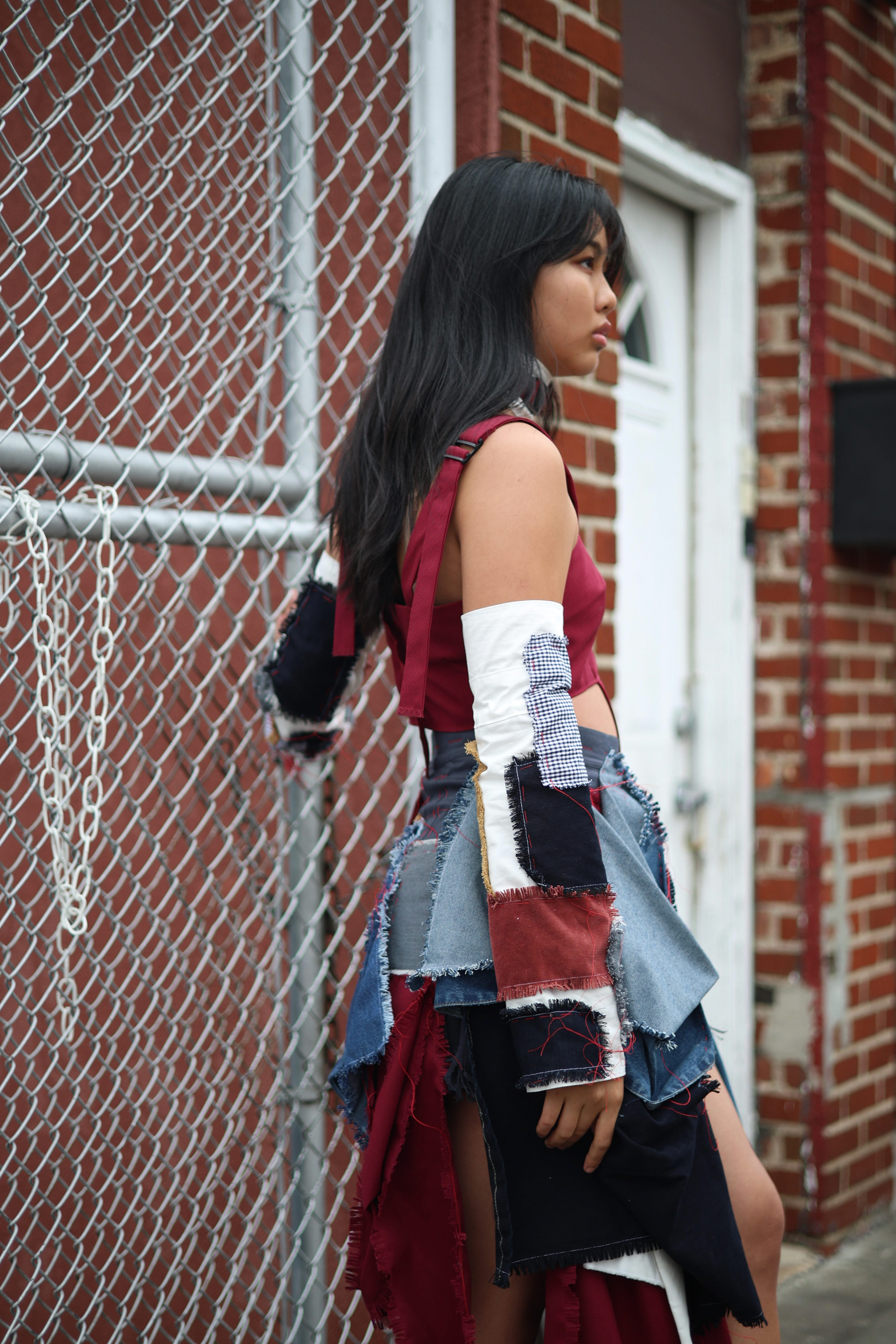 Each patch and draped skirt layer is stay stitched and individually distressed by hand on every edge to create a controlled fray. I worked to highlight the array of different sizes, colors, textures, and patterns working together to create this shape.