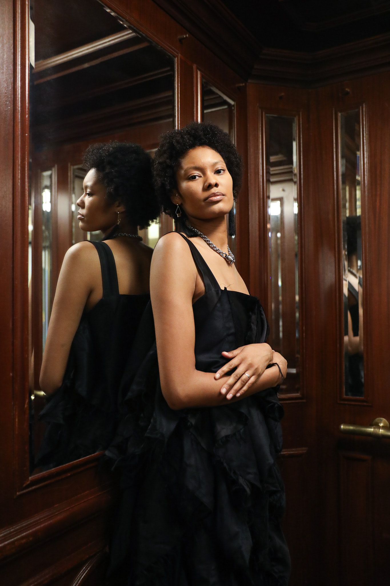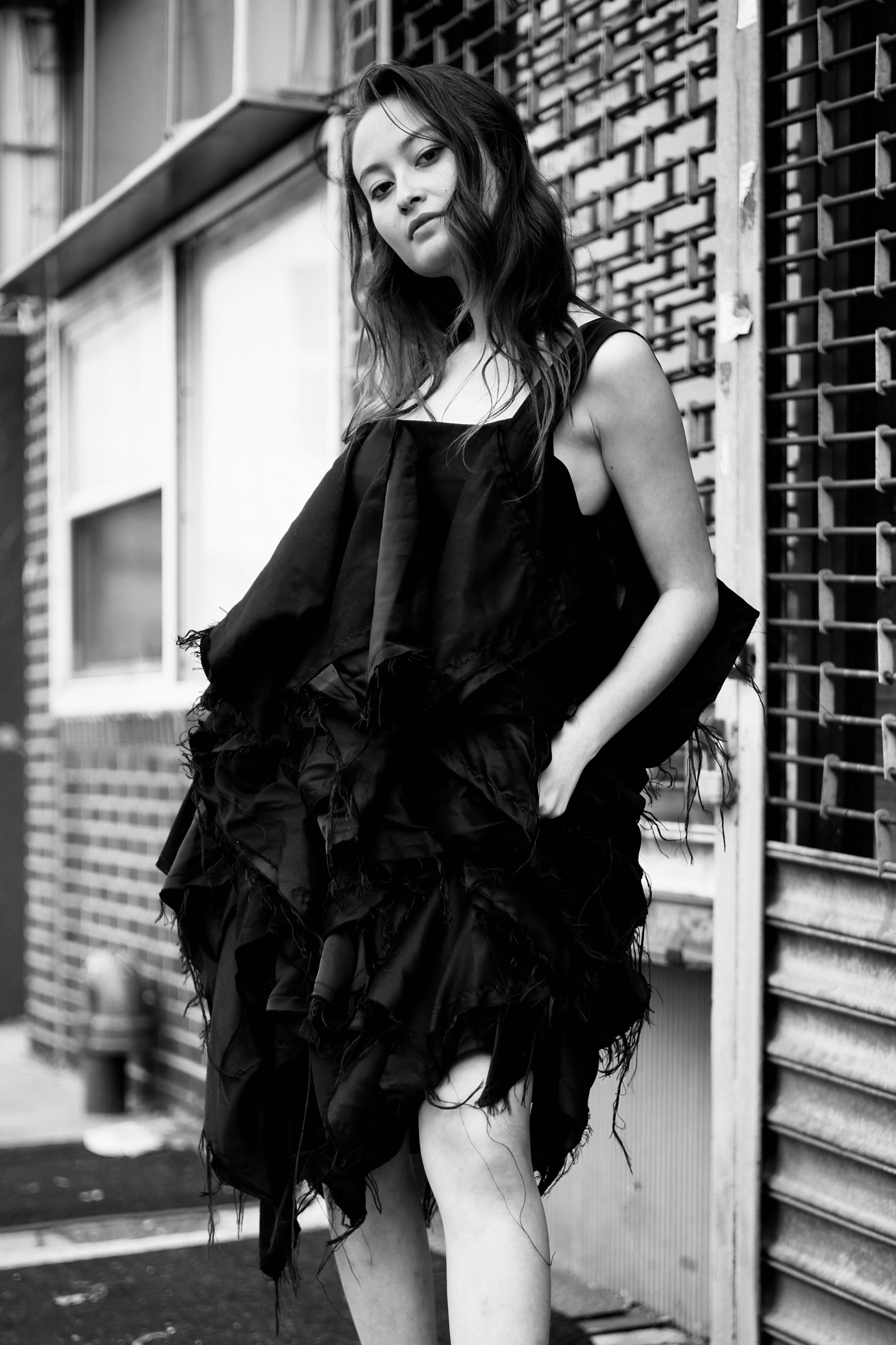 a zero-waste dress made with eight yards of reclaimed fabric.